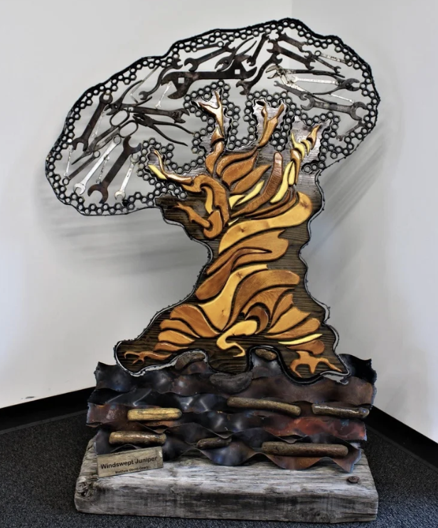 Crafted from driftwood, reclaimed metal, and tools passed down through generations, Windswept Juniper by Matthew Obold-Geary is both sculpture and story—a tribute to resilience, wisdom, and the quiet power of time. Winner of the Untold Stories of Aging 2024 First Prize Award, the five-foot-tall piece transforms discarded materials into a symbol of endurance, connecting the artist’s family history with the timeless lessons of nature. Like the juniper that inspired it, Matthew’s work reminds us that even when weathered by life’s elements, we remain rooted, strong, and full of wisdom.